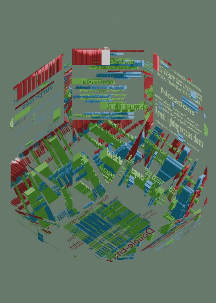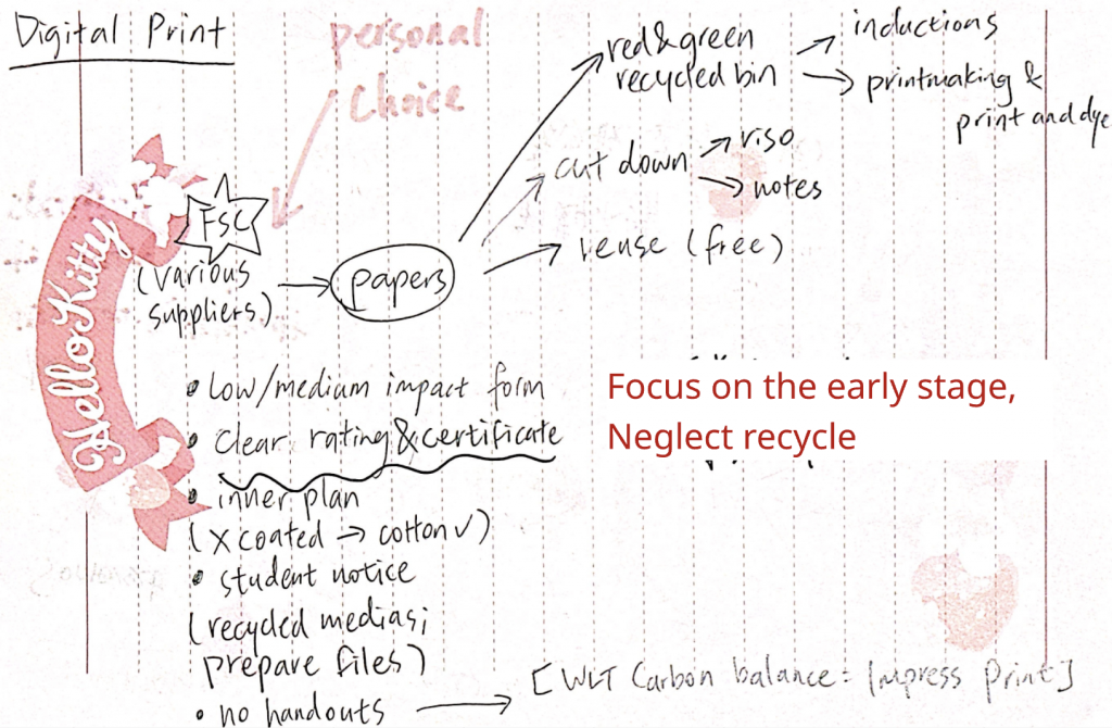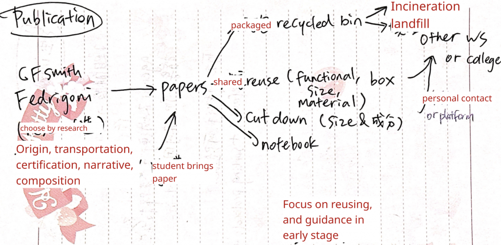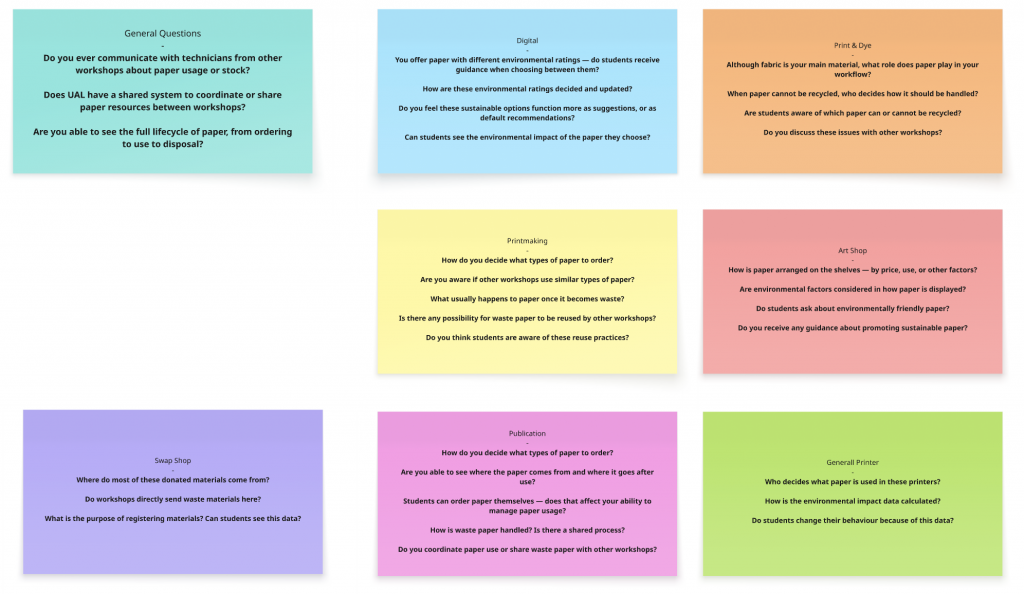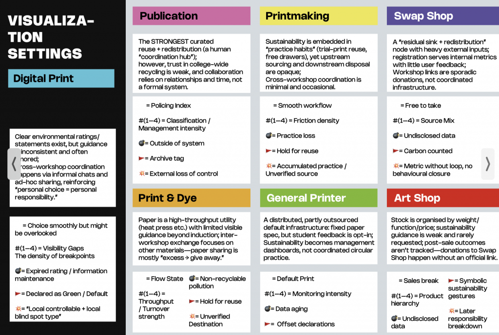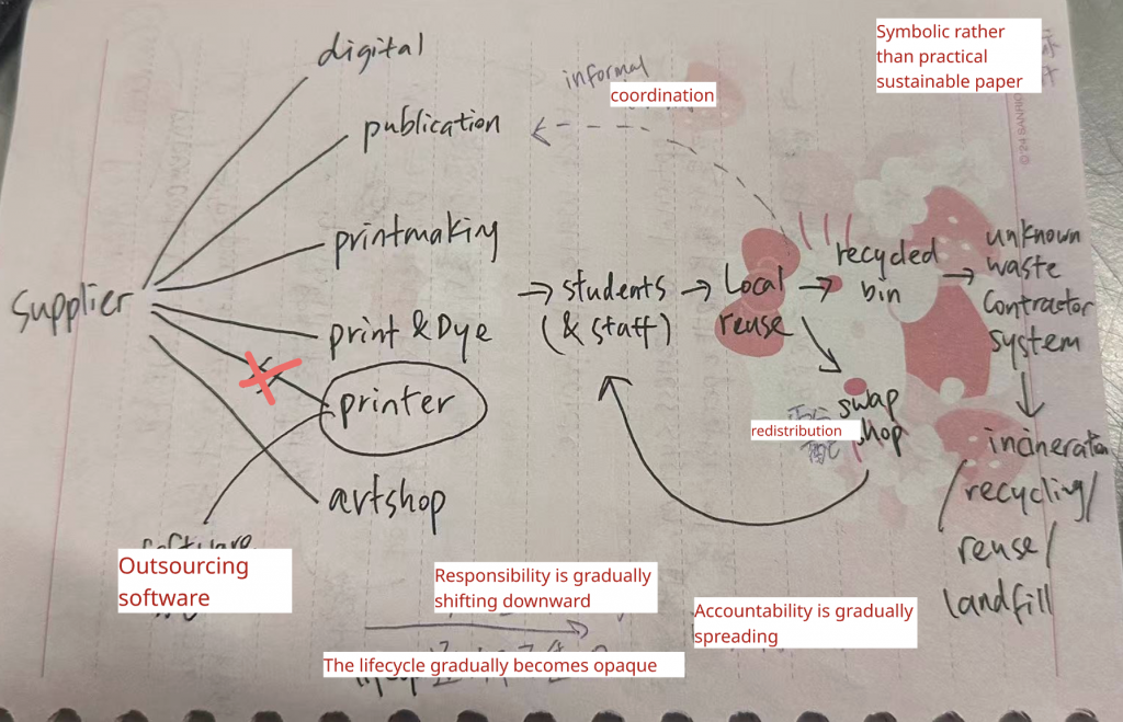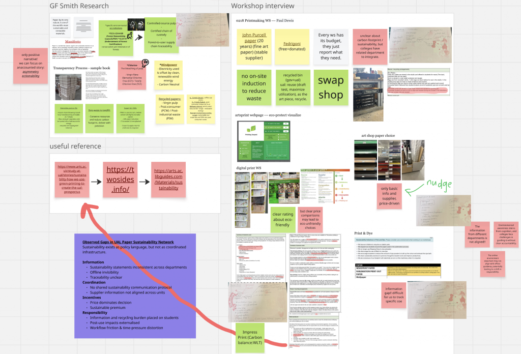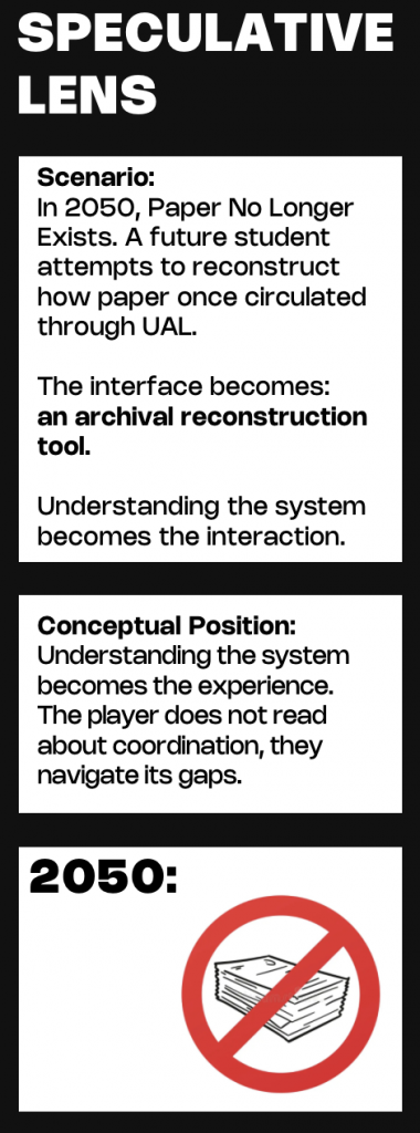 Through this project I clarified my position as a practitioner: I am strongest as a researcher and framework-builder who translates messy institutional realities into legible structures. I led much of the inquiry by interviewing students and workshop technicians across departments, then synthesising their accounts into a speculative “future archaeology” of UAL’s paper circulation in 2026, informed by the university’s net zero plan.