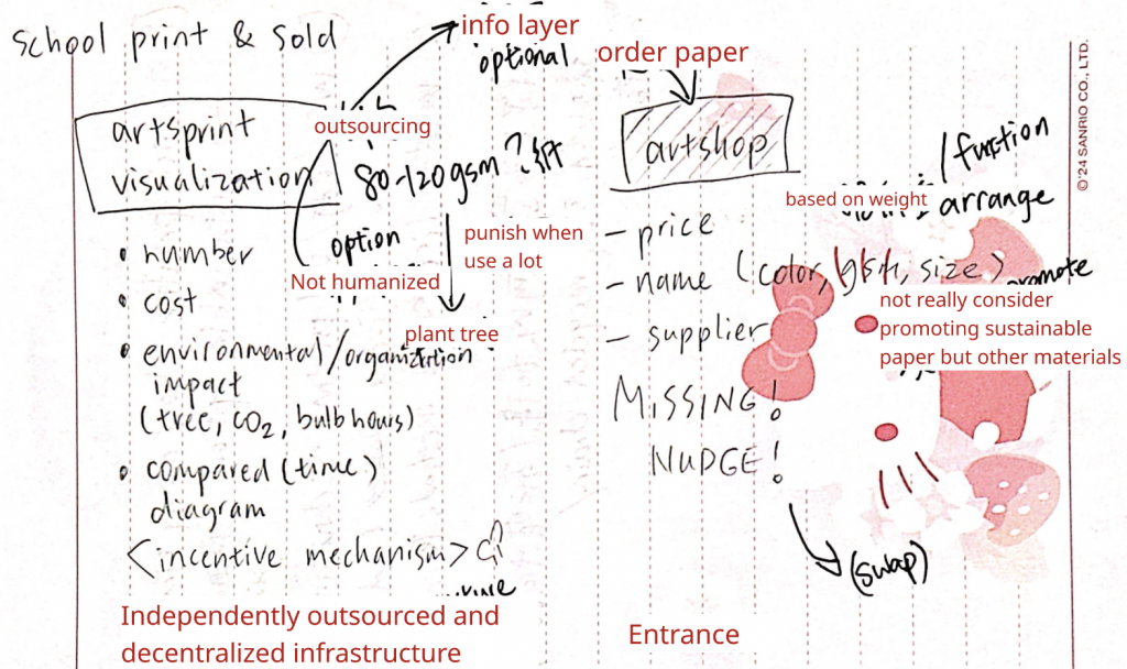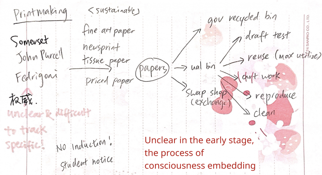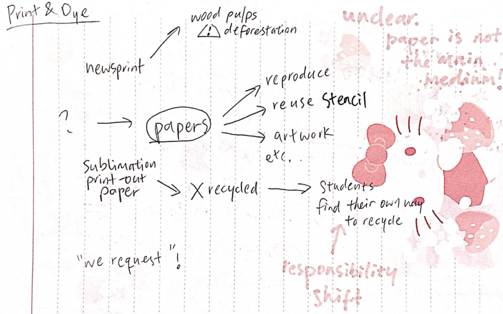 After the week 1 Friday presentation, Ruoying and I designed the questions for the student survey. She was in charge of most of it, and after I got the analysis of the student survey, I designed the specific questions for the survey of 7 departments (Digital Print, Printmaking, Publication, Print & Dye, Art Shop, Swap Shop, General Printer). The questions are based on my previous research and on the keywords: agency, paper lifecycle, cross-departmental coordination, and sustainability incentives.