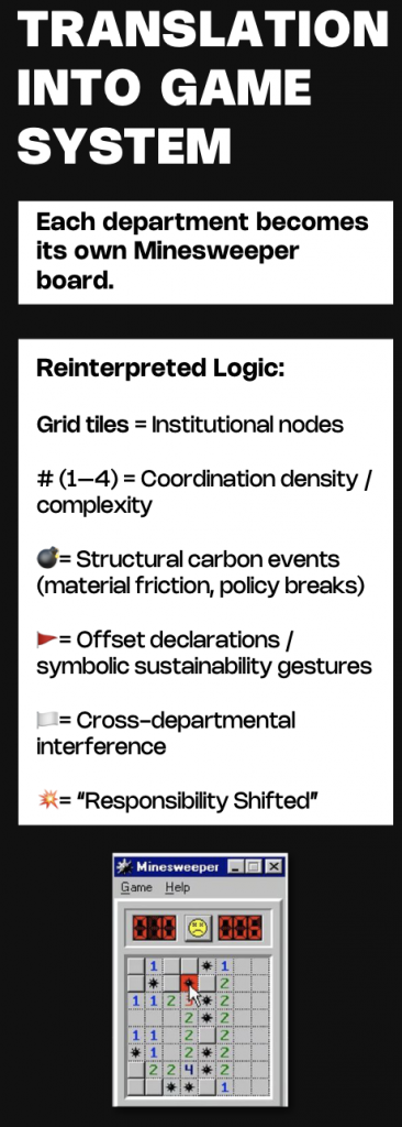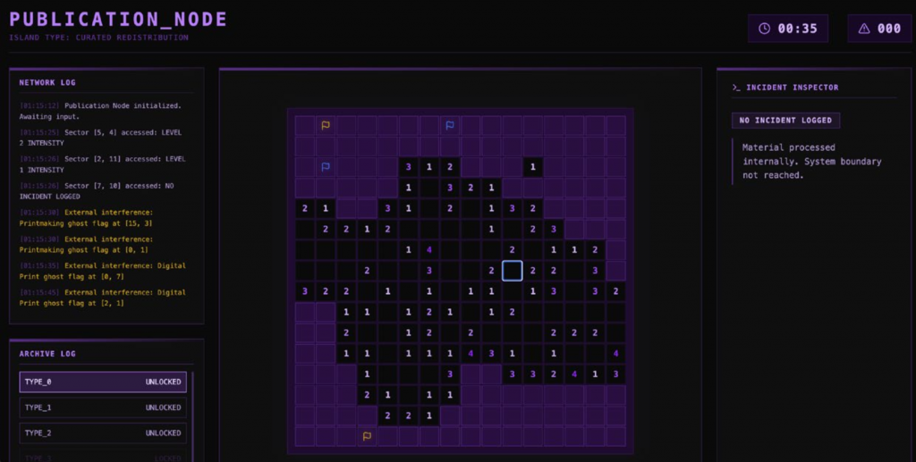 Following this logic, we treated our own investigation as a form of “future archaeology” and explored a more playful, disruptive mode of presentation—eventually developing an interactive web experience (a hacked Minesweeper-like structure) to make coordination gaps and invisible connections felt rather than merely described.