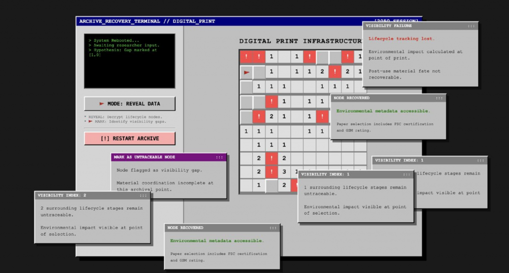Dunne and Raby helped me reframe “the future” as a critical medium rather than a destination. They write that futures are “not a destination… but a medium” to think with, becoming critique when they expose the limits of the present (Dunne and Raby, 2013, p.3). However, the most useful contribution for my work is their treatment of preferable futures. They insist that “preferable” is never straightforward—preferable for whom, and who decides?—and note that it is currently shaped largely by government and industry, while public participation as consumers and voters remains limited (Dunne and Raby, 2013, p.5). This pushed me to read sustainability less as an awareness problem and more as a question of agency and decision-making structures: what counts as “better” is often already scripted through defaults, visibility, and control over choice. Their framework directly informed our final outcome. We used a paperless-future premise alongside a “future archaeology” stance, translating our research into a web-based game. By constructing—and deliberately hacking—its internal rules, we made systemic breaks in coordination and shifting responsibilities visible, inviting viewers into debate rather than presenting a solution.